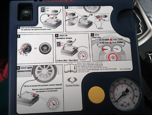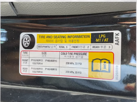 차량 트렁크 안 속에 잘 찾아보시면, 타이어 공기압 키트 하나씩 있습니다. 찾으셨다면 설명서를 천천히 읽으면서 따라 하시면 되는데요 먼저 타이어 공기압 키트를 꺼내셨다면 시거 잭을 연결해 주시고 시동을 겁니다. 여기 본인 차량 운전석 문 밑에 적정 공기압표 스티커가 부착이 되어 있습니다. 적정 공기압표 써져있는 스티커를 참고하시고 타이어 마개를 분리를 합니다. 이후 타이어 공기압 주입구에 구멍에 맞게 오른쪽으로 돌리면서 연결을 합니다. 연결 도중 바람이 빠지는 소리가 들리지만 빠지지 않게 단단히 돌려줍니다. 단단히 돌려줬으면 공기압 스위치를 켜줍니다. 요란한 소리와 함께 적정 공기압표 스티커를 참고해서 눈금에 표시되어 있는 부분까지 충전을 합니다. 이렇게 다른 타이어 공기압 낮은 부분도 동일하게 진행하시면 되겠습니다.