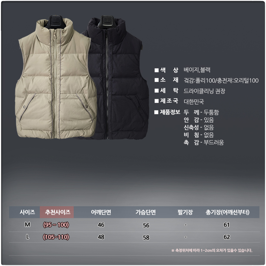 오리털 남성 경량 패딩 조끼