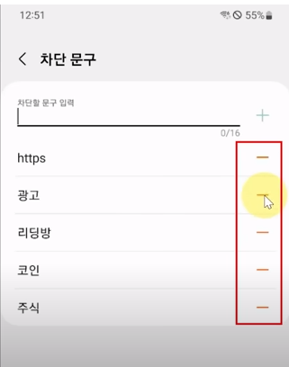 내가 차단할 단어들을 하나씩 추가할 수가 있어요. 물론 주의하실 점은 이 단어가 들어간 문구가 광고가 아님에도 불구하고 다 차단이 되기 때문에 단어 등록시 신중하게 넣어주셔야 해요.