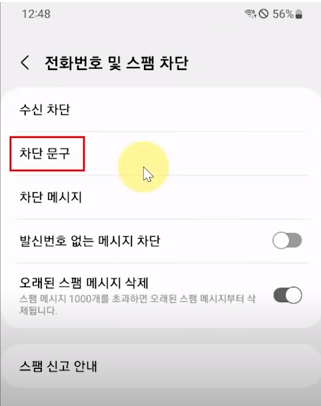자 그러면 위쪽에 메시지 설정이라고 뜨고 우리가 받는 메시지에 대한 설정을 할 수 있는 곳입니다. 아래쪽에 내려보시면, 전화번호 및 스팸 차단이라고 있어요. 여기 클릭해 보세요. 여기 차단 문구라고 되어 있어요. 여기 클릭해 주세요. 그러면 차단 문구라고 뜨고 현재는 차단한 문구가 없습니다라고 뜨실 거예요. 이게 무슨 말이냐 하면 특정한 단어가 들어있는 문자를 모두 다 차단하는 겁니다.