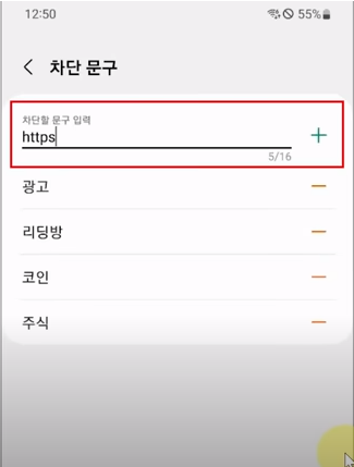 우리가 가장 두려운 게 뭐예요? 바로 링크가 포함된 문자입니다. 이 링크를 잘못 클릭해서 우리 개인 정보가 다 빠져나간다던가 뭐 내 통장 정보나 혹은 뭐 계정 정보가 다 빠져나가면 이게 큰 문제가 될 수가 있잖아요. 그래서 링크가 들어있는 모든 문자들을 받고 싶지 않다면, 이런 문자들은 링크의 맨 앞에 HTTPS라는 영어가 항상 붙어있고 이거를 차단 문구로 입력해 주시면 됩니다. 이렇게 해 두면 굉장히 편리하게 우리가 스팸 문자 대부분을 걸러낼 수가 있겠죠.