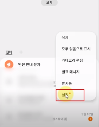 핸드폰에 들어가시면 메세지가 있어요. 우리 보통 오른쪽 아래에 많이 있는데, 메시지 클릭하시면 그동안 내가 받았던 이런 문자들이 보이죠. 이 문자들 오른쪽 옆에 점 세 개가 있습니다. 맨 아래쪽에 설정이라고 있어요.