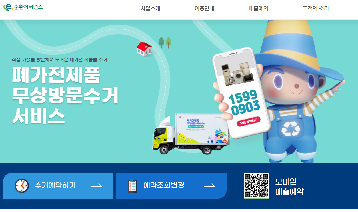 아직도 주민센터 가서 대형폐기물 스티커를 만원 넘게 돈주고 사는 분들이 있는데, 이제 안 그래도 됩니다. 바로 이 '폐가전제품 무상방문수거 서비스'를 이용하면 됩니다. 이 서비스는 일단 무료이면서, 전국 어디서나 가능하다는 점이며, 심지어 수거하러 직접 기사님이 집까지 오신다는 겁니다. 인터넷에서 폐가전무상 방문이라고 검색하거나 아래 링크를 통해서 나오는 홈페이지 메인에 있는 수거 예약하기를 눌러서 신청하면 됩니다. 근데 이 서비스에도 단점이 있는데요, 방문할 때 사람이 집에 있어야 하는데 내가 원하는 시간까지는 선택은 어렵다는 겁니다. 그리고 특히 소형가전은 최소 5개정도 모여야 수거가 가능합니다.