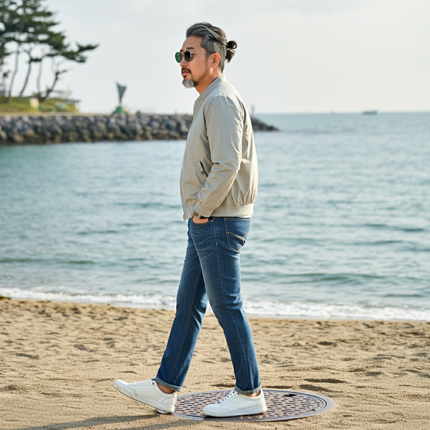 아우터로는 클래식한 트렌치코트, 활동적인 블루종, 혹은 실용적인 사파리 재킷 등이 좋습니다. 특히 카키색이나 네이비 컬러는 어떤 스타일에도 무난하게 어울리며, 중년 남성의 깊이 있는 매력을 더욱 돋보이게 해줍니다.